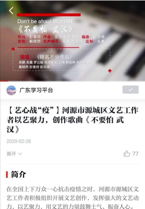 我校教师黄佩参与创作歌曲《不要怕 武汉》,用文艺的力量歌颂先进事迹,鼓舞抗疫斗志,消除精神恐慌,传播战疫力量。