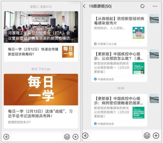 学校通过微信公众号推送《致全体师生、家长的公开信》,号召全体师生积极落实“八个做到”、“二个不”系列预防措施,有效应对疫情发展。为进一步加强新型冠状病毒感染的肺炎疫情防控宣传教育,学校从2月11日起,在学校微信公众号开设“每日一学”专栏,每日为师生、家长推送时政要闻、教育动态及防疫指引。
