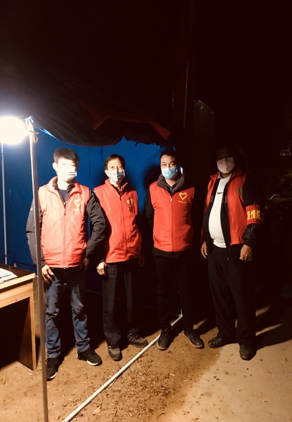 刘金胜(右二)与村干部在四甲东坑村监测点值夜班