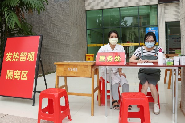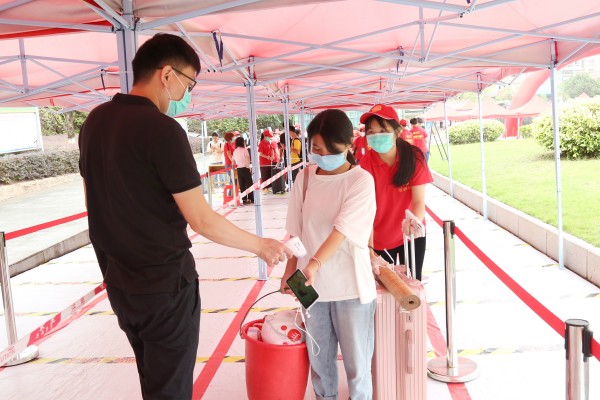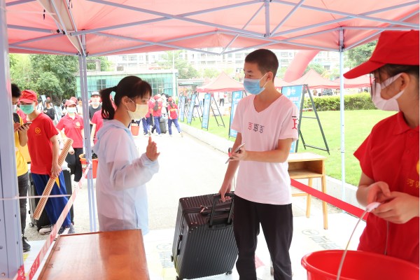 报到当天,现场设立医务处,新生依次扫“粤康码”、核验健康情况、体温检测等步骤,检测合格方可进入报到程序。