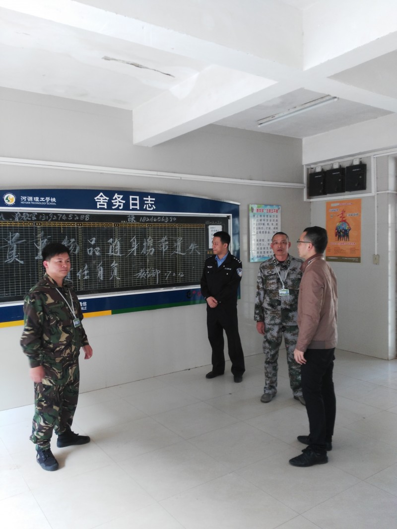 随后,学生科干部邱前绮同志带领彭教导员到我校门卫室、宿舍值班室对安保力量配备、防暴器械、监控设施进行了逐项检查。在检查中,他对门卫保安兢兢业业的工作态度表示肯定,现场演示安防设备的正确操作方法和检查监控设备,就学校安保业务方面等问题与我校教官队寇坤队长进行了交流。紧跟着在值班教官陪同下,彭教导员检查了宿舍监控设备、消防设施设备,并听取了宿舍值班教官工作上的特点和难处。彭教导员指出,学生每天在宿舍的时间比较长,宿舍安全保卫工作要高度重视,不能出现起哄、打群架等群体事件,确保宿舍区安全、稳定。